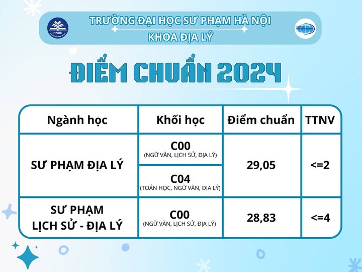 Ngày 18/08/2024, Trường Đại học Sư phạm Hà Nội công bố điểm chuẩn các Ngành. Trong đó Sư phạm Địa lý với số điểm chuẩn là 29,05 (TTNV <=2)